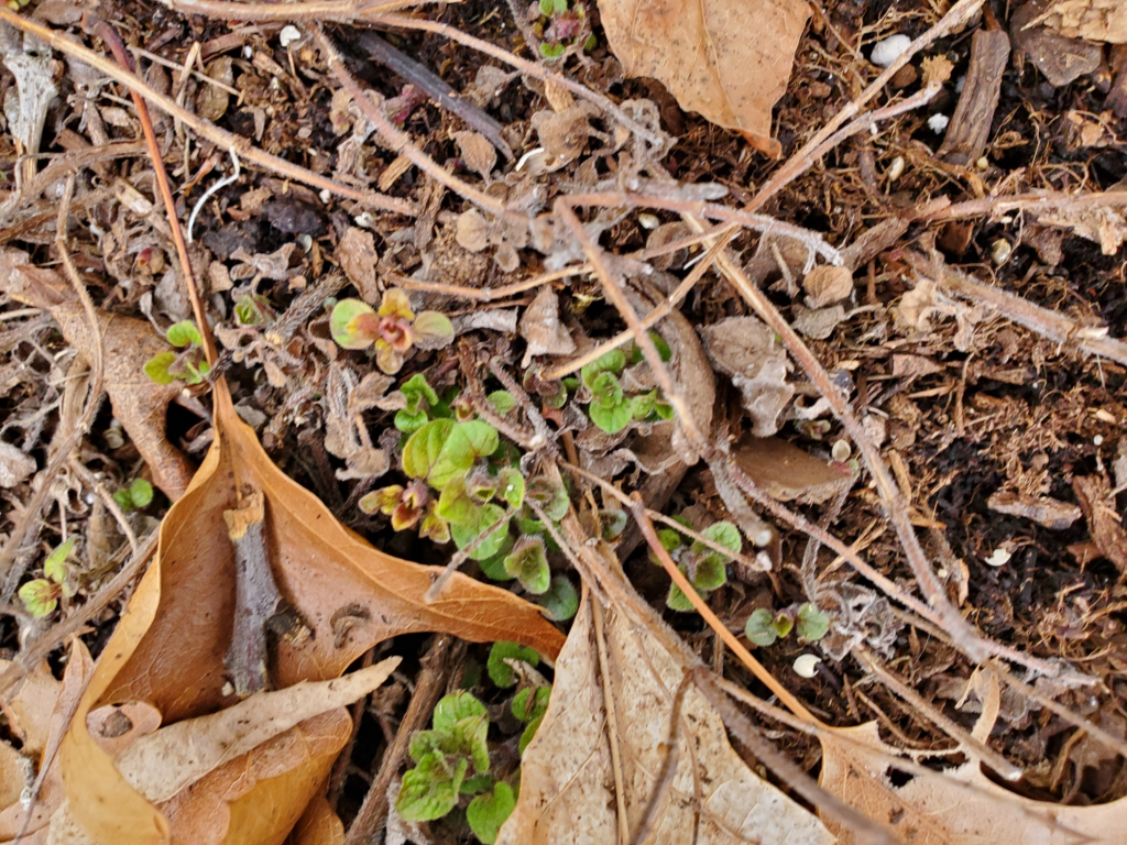 Secondly, as I was assessing how much work I need to do to prepare the beds, I noticed that we had a perennial (or volunteer plant? I will have to check which one chamomile is) that was growing again. Below we have some German Chamomile that is doing much better than I ever saw it do when I purposely planted it. Perhaps this is because it is a cool weather herb?
